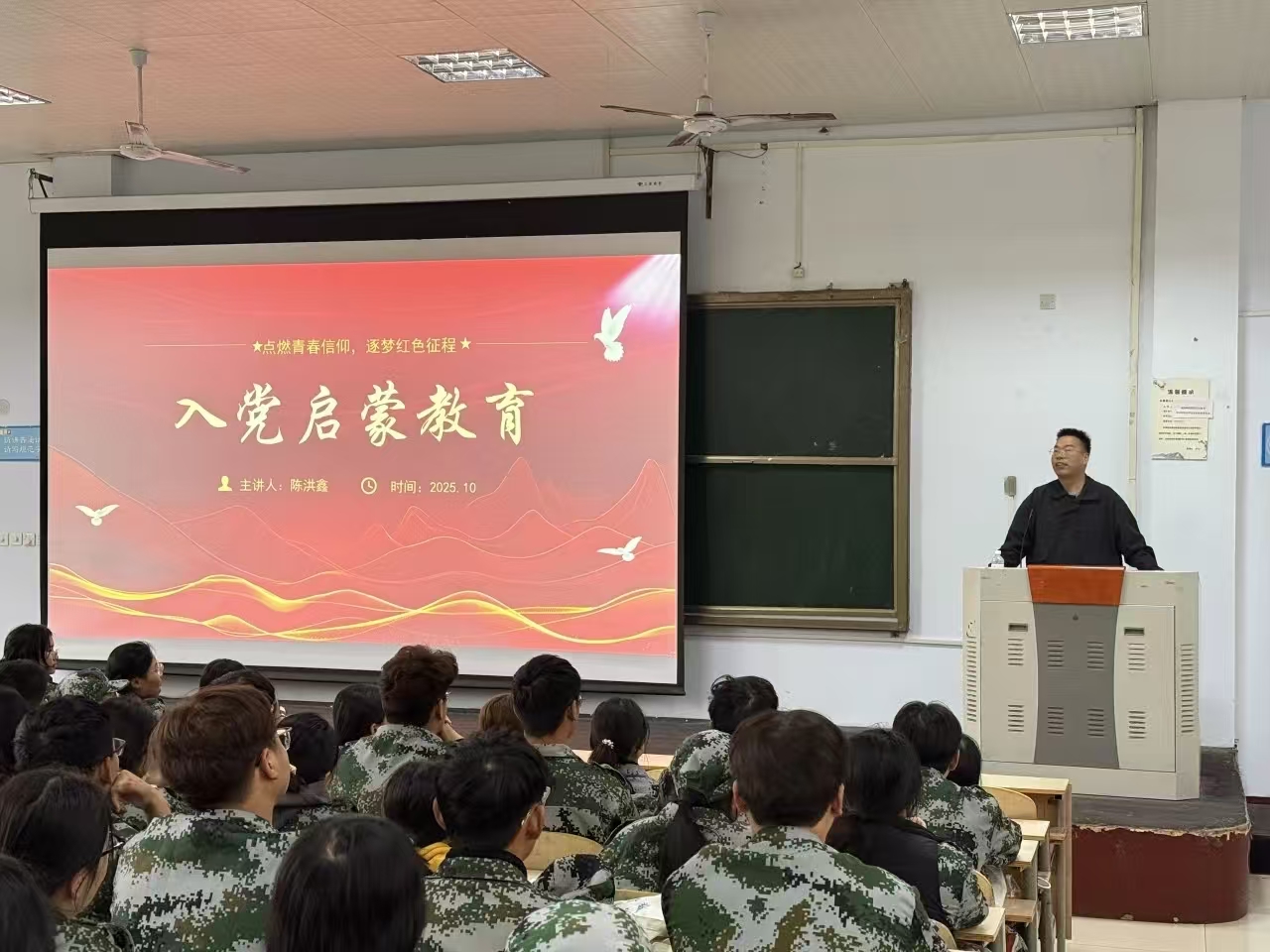 随后,陈洪鑫围绕入党全流程展开系统讲解,从申请入党的基本条件、党员的核心标准,到入党积极分子的确定程序、教育培养与考察要求,再到大学生入党的具体流程及关键注意事项,均进行了细致拆解与说明。他特别提醒新生,要主动加强党的创新理论学习,自觉遵守校规校纪,在提升专业能力的同时锤炼思想觉悟,以实际行动积极向党组织靠拢,争取早日成为一名合格的共产党员。