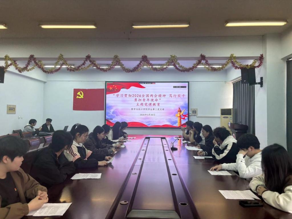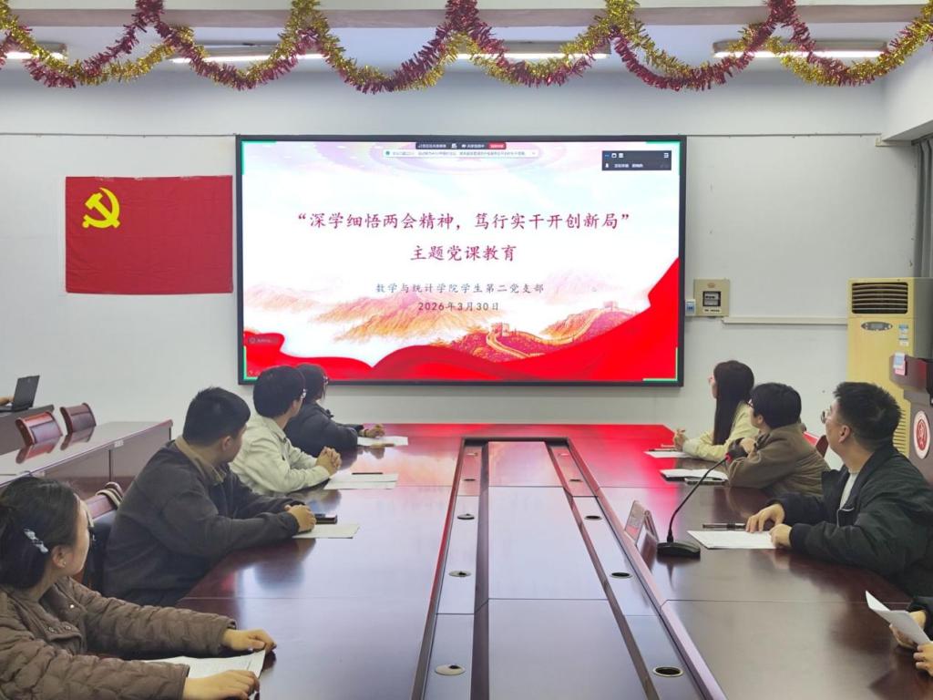 3月30日,学生第二党支部以“深学细悟两会精神,笃行实干开创新局”为主题开展专题学习。支部书记陈洪鑫领学2026年全国两会精神核心要义,组织全体党员共同观看《“十五五”奋进之声,总书记两会时刻》学习视频。他强调,要深刻把握“十五五”开局部署,将两会精神与专业学习、实践创新紧密结合,以实干实绩践行使命担当,为学院高质量发展贡献青春力量。
