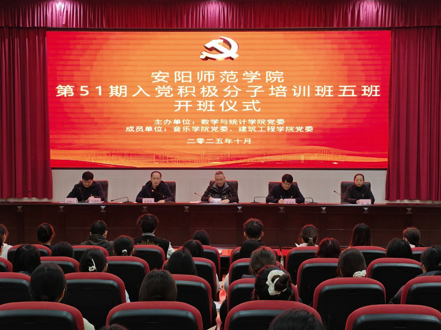 10月22日晚,由数学与统计学院党委主办,音乐学院党委、建筑工程学院党委协办的第51期入党积极分子培训班五班开班仪式在文博二楼报告厅举行。数学与统计学院党委书记姚亚辉、副书记王国辉,音乐学院党委书记杨安民、副书记耿苗,建筑工程学院党委书记张玉峰参加开班仪式。